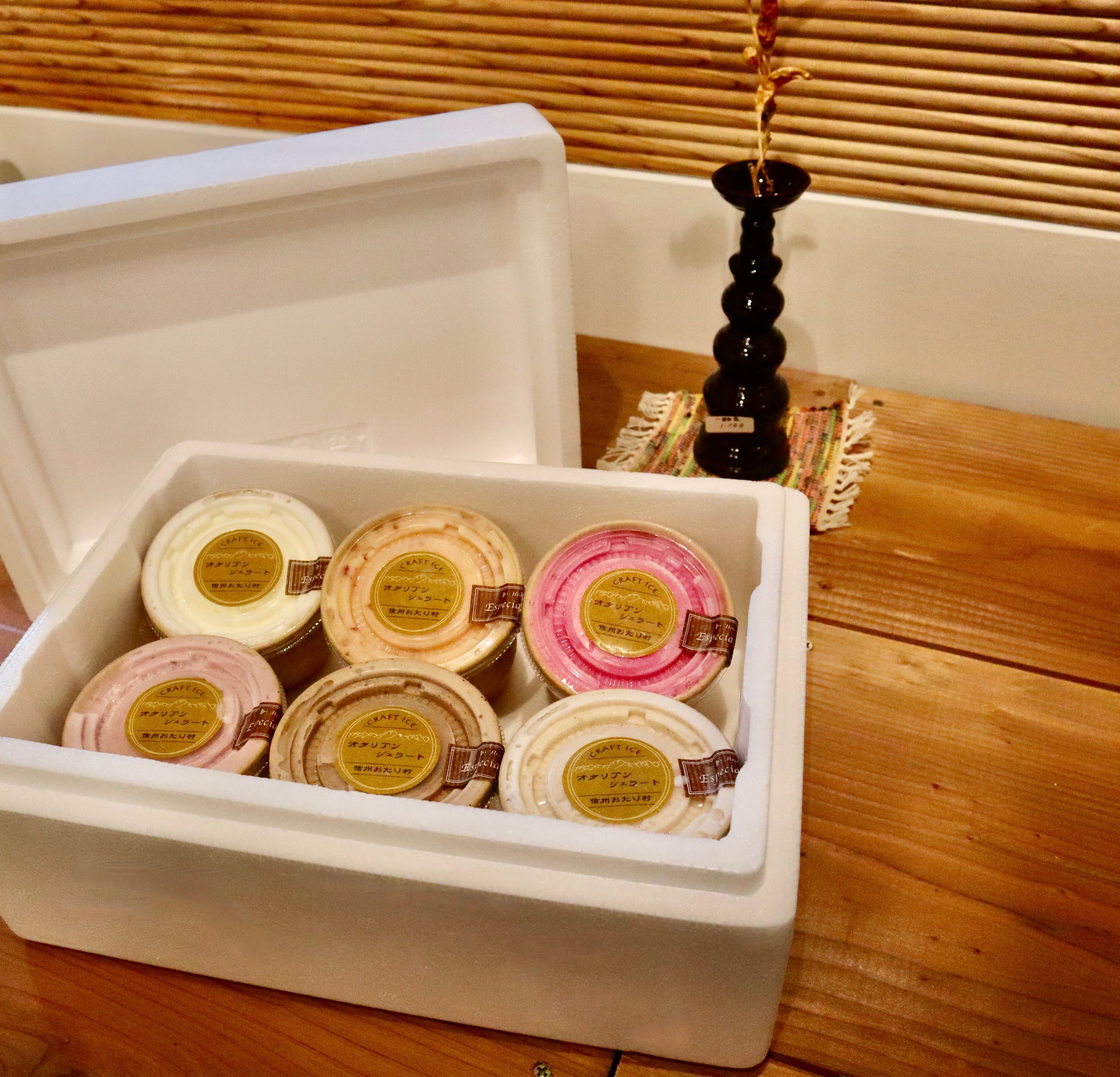 当店おすすめの、おたり村の名店 蕎麦屋蛍 自家焙煎そばジェラート×2 濃厚ミルクジェラート×2 その他季節のジェラート×2 (酒粕、ベリー系、さるなし、ネクタリン、くろもじ、かぼちゃなど、)シーズナルなフレーバーも含まれていて、季節ごとに新たな楽しみを提供します。